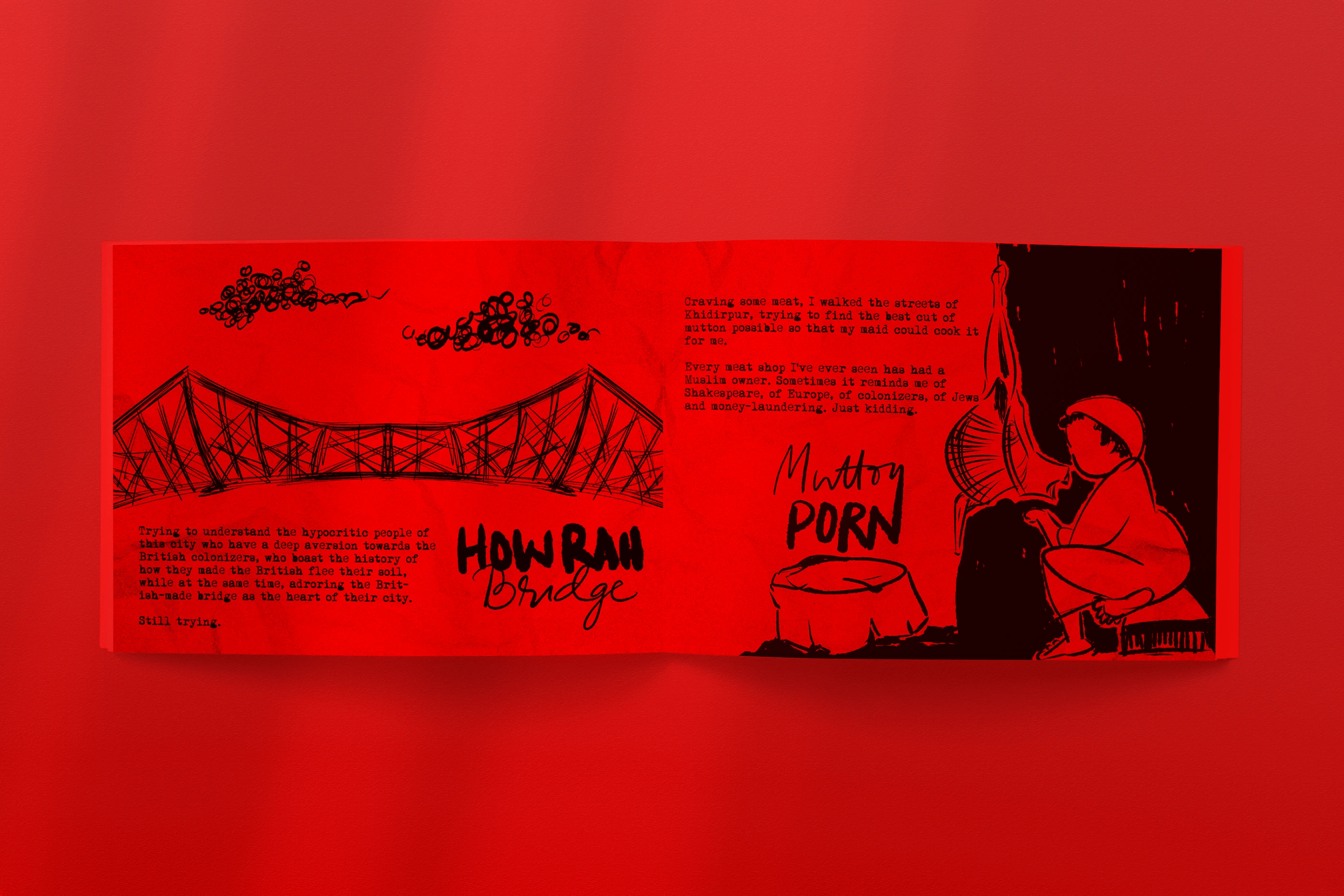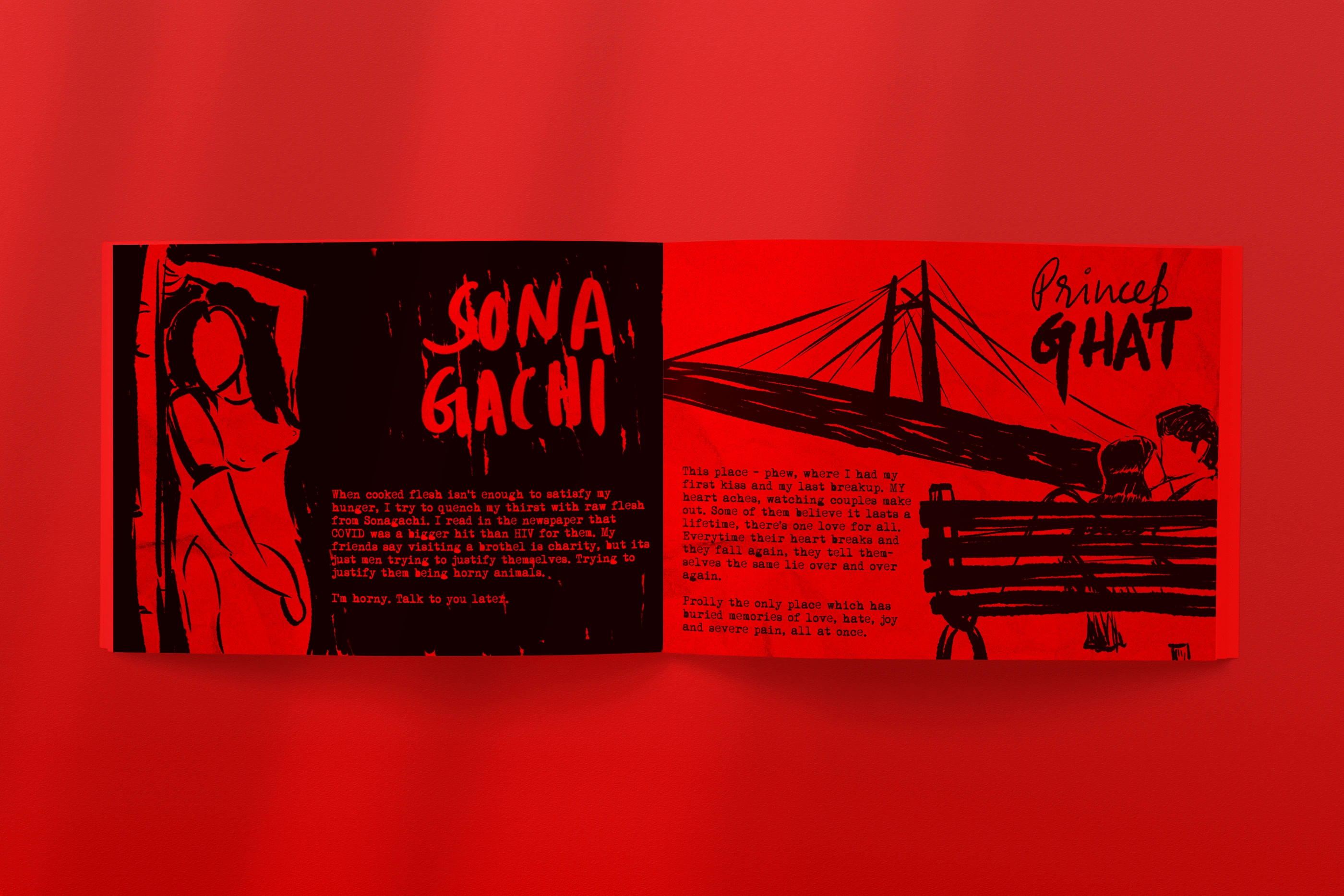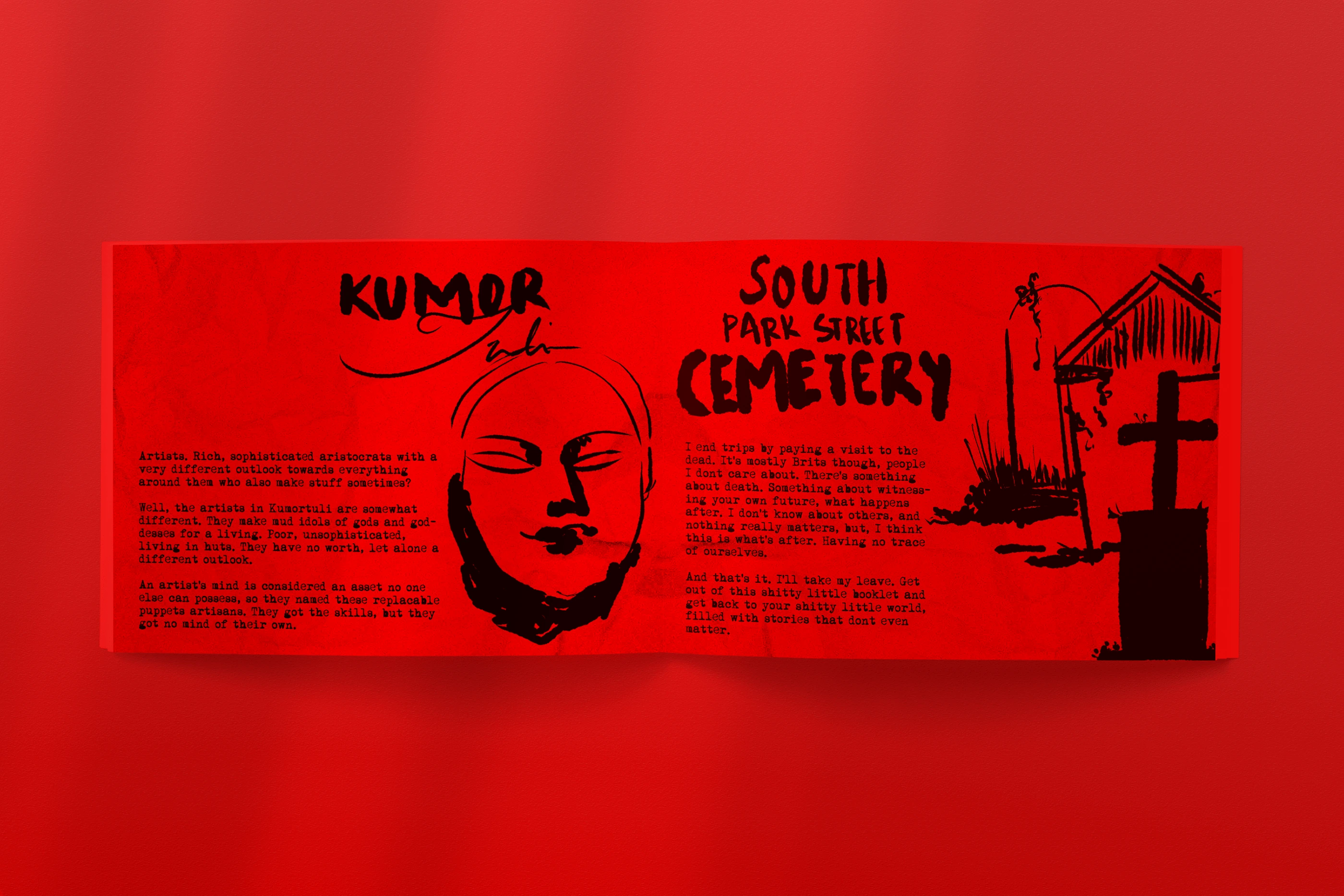 A college project of creating a booklet about exploring a place, turned into a self-expressionary dark satire, illustrated in a raw fashion.