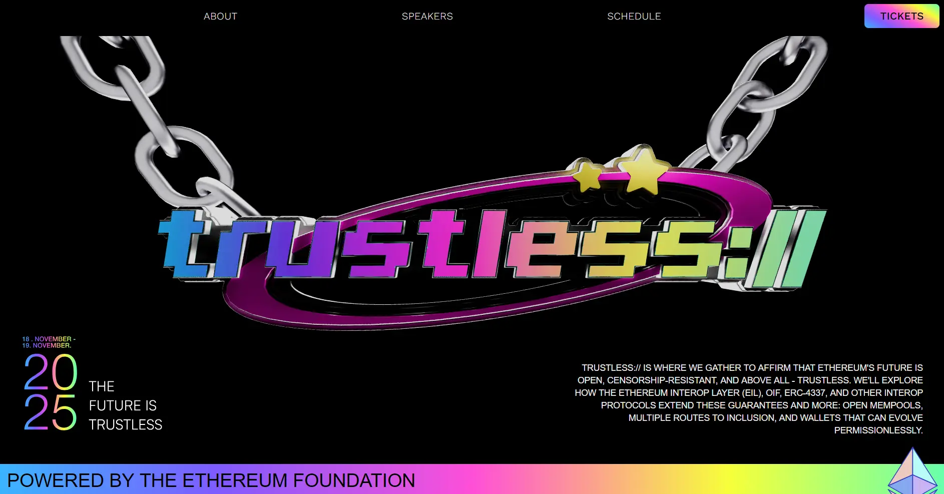 A conference by the Ethereum Foundation announcing the trustless:// protocol. Trustless is to web3 what Y2K was to the internet, a turning point into a new era. That parallel shapes the brand, drawing from the digital optimism of that era and reworking it into something that feels forward.